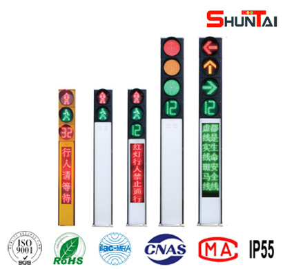 可嵌入式安裝行人過(guò)街語(yǔ)音提示器和戶外表貼LED顯示屏。側(cè)面可外掛人行燈,實(shí)現(xiàn)雙燈或三燈共桿。